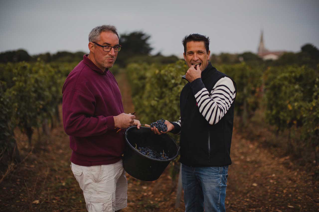 Jérôme Poulard, responsable technique et contrôles d’Uniré, et Benoît Penanhoat, oenologue maître de chai, mettent en musique, en duo, les vendanges des Vignerons de l’île de Ré. Dans cette période très intense, ils ont fait une courte pause pour nous en parler.