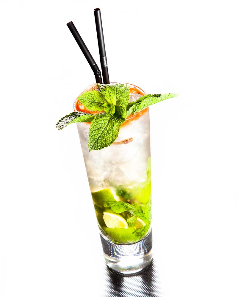 Dans un verre long drink, écraser délicatement au pilon les feuilles de menthe et le citron vert avec l’Angostura bitter et le sirop de sucre de canne.