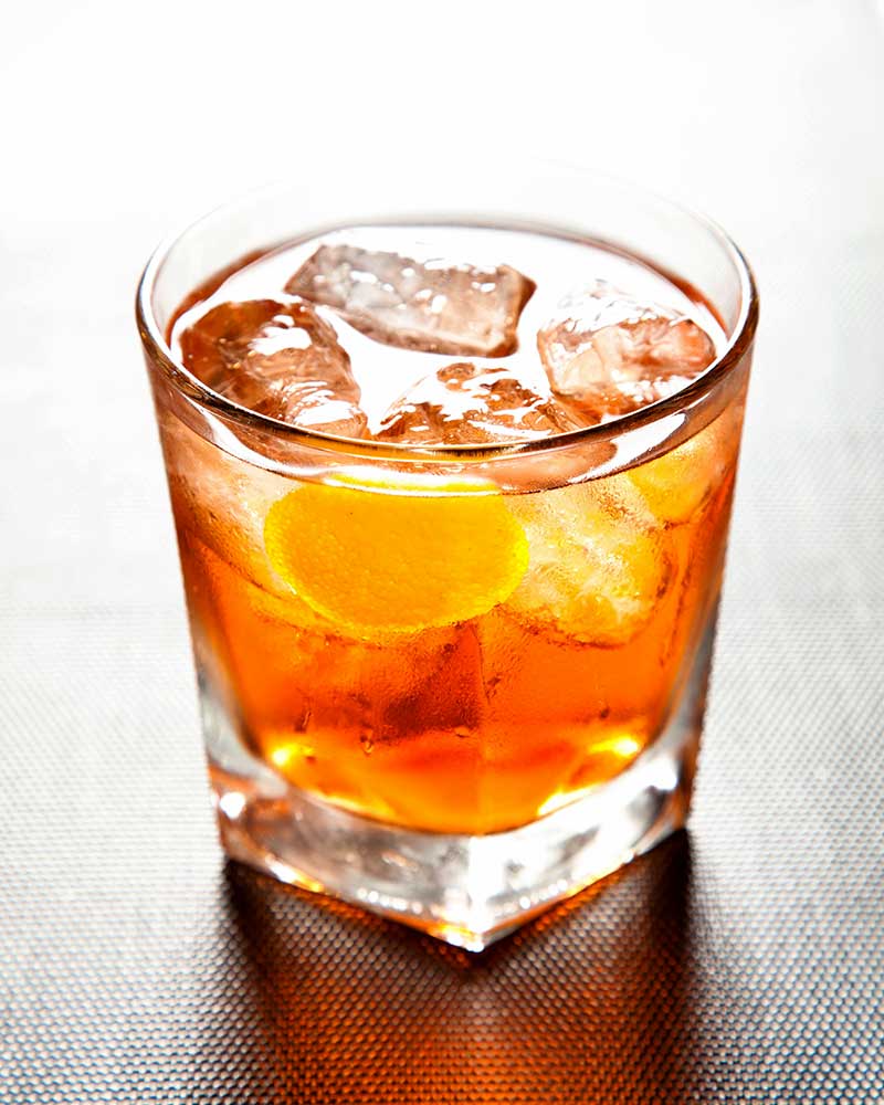 Transvaser dans le verre de service, ajouter des glaçons et le zeste d’orange.